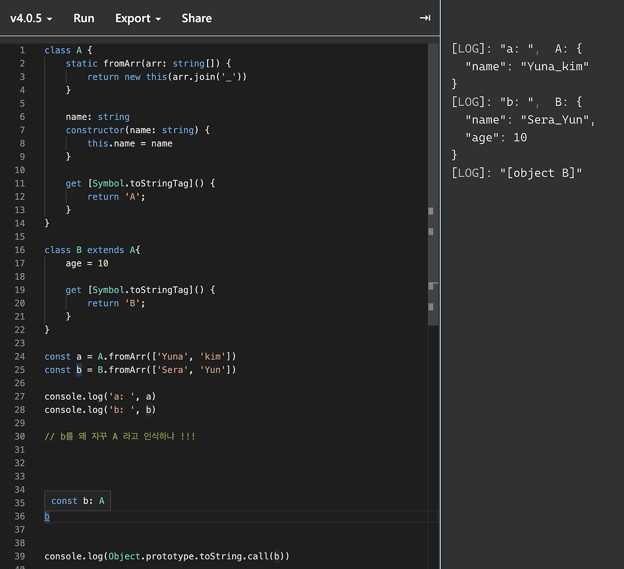 근데 오른쪽에 로그에 나온 것처럼 자바스크립트에선 잘 B 클래스의 인스턴스로 생성이 되었으며 내 의도대로 된 것을 볼 수 있다.